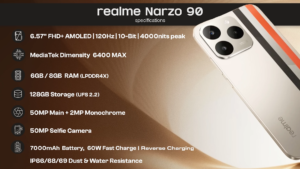 Realme Naruto 90 comes with 6.57 inches HD AMOLED display and 120 HZ and 10 bit and 4000 nits peak. Disco runs with Meditech Dimensity 6400 MAX Processor. And this phone has 6GB/8GB Storage Options. 128GB Internal Storage. this has best camera features 50Mega pixel Main Camera+ 2MP Monochrome and 50MP Selfie Camera and it comes with 7000mAh Battery, 60W Fast Charging and Reverse Charging and it also comes with IP66/68/69 Dust and water Resistance. This phone comes with complete water resistance with IP66, IP68, IP69.